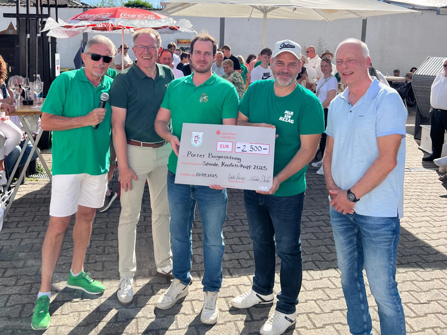 Das Kindertanzkorps kam etwas später zum Sommerfest, denn vorher fand noch ein Auftritt bei den Wahner Wibbelstetzen statt. Die Kinder reisten stilecht mit einem Planwagen an und hatten bereits viel Spaß und eine sehr gute Stimmung bei der Anreise. Der Höhepunkt des Festes war die feierliche Spendenübergabe an die Porzer Bürgerstiftung. Der Erlös ausdem Golfturnier „Konfetti Kapp“ in Höhe von 2500 Euro wurde durch den Präsidenten Walter Reinarz sowie die beiden Schatzmeister Markus Dobler und Markus Lüsgen überreicht. Sie übergaben den Scheck stolz an die Vorstandsmitglieder der Bürgerstiftung, Gregor Berghausen und Thomas Meurer, die